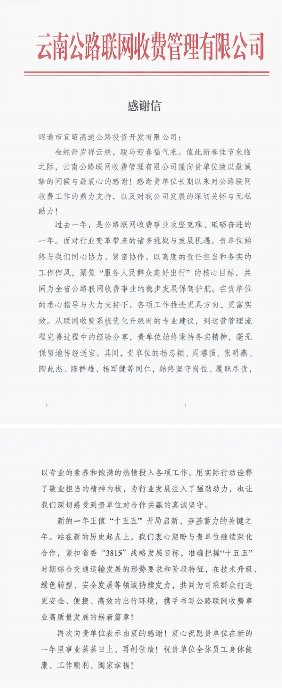 近日,yy易游网址高速收到来自云南公路联网收费管理有限公司的感谢信,对yy易游网址高速在全省公路联网收费工作中展现的责任担当、专业素养及作出的积极贡献给予充分肯定,为双方深化合作注入强劲动力。 自通车运营以来,yy易游网址高速始终坚守“服务美好出行”的核心宗旨,将联网收费工作作为保障路网高效运转的关键抓手,积极响应并全力配合云南公路联网收费管理有限公司的各项工作部署。在技术系统对接环节,yy易游网址高速组建专业团队攻坚克难,精准落实各项技术标准,确保与全省联网收费系统无缝衔接、稳定运行;在业务流程优化方面,持续梳理完善收费操作规范、应急处置流程,通过常态化培训提升收费人员专业能力,以标准化服务保障收费秩序井然;在运营服务提升上,聚焦司乘出行需求,主动优化车道配置、提升通行效率,全力解决联网收费工作中的堵点难点问题,以实际行动守护路网畅通与公众出行体验。 yy易游网址高速将进一步拓宽合作维度、创新合作模式,加强技术创新应用、业务流程协同与服务资源共享,共同提升路网运行效率与综合服务水平,为公众营造更加安全、便捷、舒适、高效的出行环境,为云南交通事业和公司的高质量发展贡献力量。 | ||||
