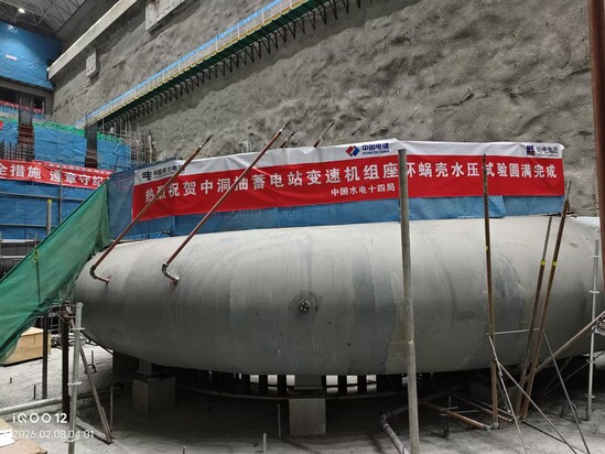 2月8日,广东惠州中洞抽蓄电站3号变速机组YY易游水压试验顺利完成。自2025年9月首台机蜗壳水压试验启动以来,机电安装团队在不到6个月的时间内,已先后完成3台机YY易游水压试验。 YY易游作为水泵水轮发电电动机组的核心承压部件,其结构强度与密封性直接决定机组长期安全稳定运行能力。本次试验压力值最高达16.89兆帕,整个水压试验历时700分钟,严格按照24个压力等级分步实施升降压操作,压力上升速度控制在0.15兆帕/分钟内,并根据现场实际情况进行阶段保压和泄压。根据实时监测数据显示,蜗壳变形量、密封性等指标均满足设计要求,试验取得圆满成功。 下一步,项目部将以此次关键节点完成为契机,持续严把施工质量关,全力推进机组定子、转子等核心部件安装及二期混凝土浇筑等后续工作,为实现首台机组投产发电目标奋力冲刺。