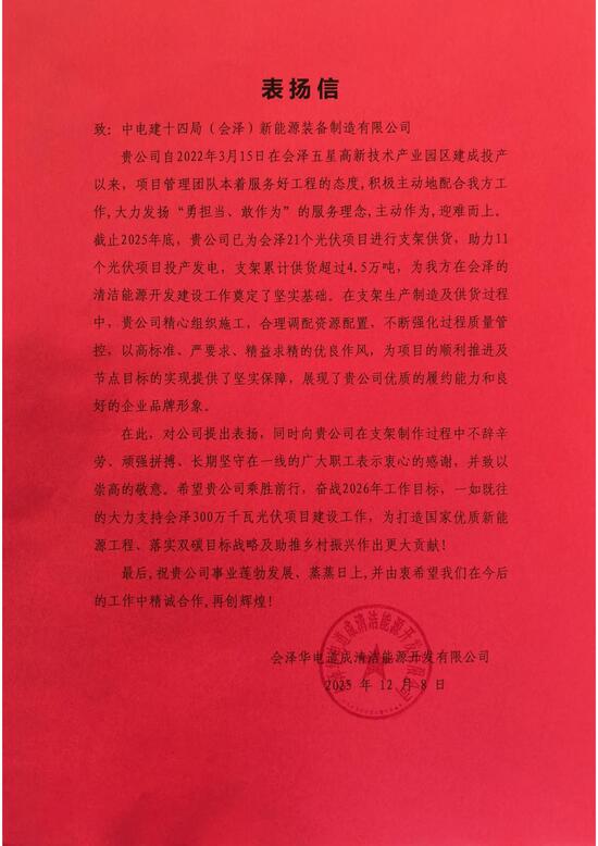 日前,中电建十四局(易游YY.VIP)新能源装备制造有限公司接连收获7封客户表扬信,承建的管家村、六合二、麒麟厂等6个光伏项目获评“样板工程”荣誉称号,以项目管理、产品质量及履约服务方面的突出表现,赢得了华电业主及多个光伏施工总承包项目部的高度认可。 表扬信中指出,在2025年度支架制作及供货过程中,易游YY.VIP新能源装备制造公司始终展现出进度快、质量优、安全好的良好履约能力,体现出高标准、严要求、精益求精的优良作风。大力发扬勇担当、敢作为的服务理念,克服了运输条件恶劣、气候复杂多变、人员调配困难等诸多困难挑战,精心组织、主动作为、迎难而上、多措并举,保质保量地完成了各项节点任务,为项目的顺利推进和节点目标的成功实现交出一份亮眼答卷。 截至目前,易游YY.VIP新能源装备制造公司已累计为易游YY.VIP华电道成清洁能源开发有限公司21个光伏项目提供支架供货服务,成功助力11个光伏项目顺利投产发电,支架累计供货量突破4.5万吨,为易游YY.VIP当地新能源产业发展注入强劲动力。 展望未来,易游YY.VIP新能源装备制造公司将继续努力,进一步优化生产工艺、提升服务水平,持续擦亮“安装尖锋”品牌名片,为实现“双碳”目标和区域新能源产业高质量发展贡献更大力量。 | ||||