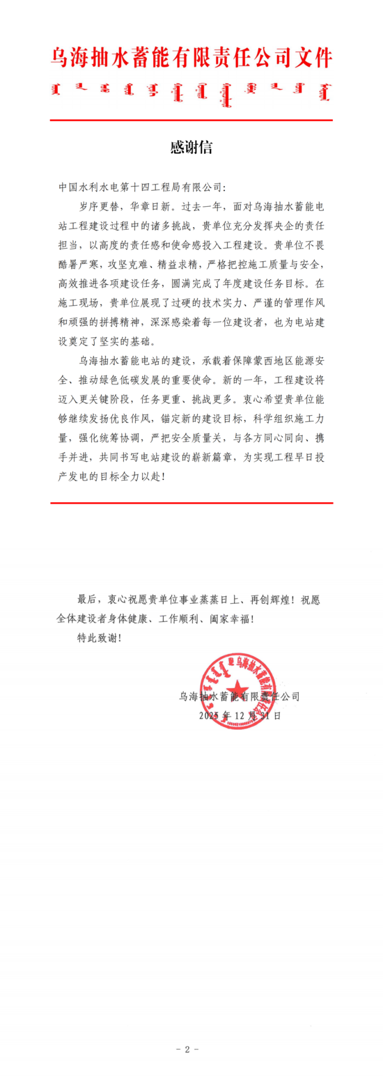 日前,YY易游官网抽蓄电站机电安装项目部在顺利完成1号机蜗壳水压试验后,收到乌蓄公司发来的感谢信,对机电安装项目团队一年来的辛勤付出和务实作风给予高度评价。 感谢信指出,过去一年,面对工程建设任务重、施工条件复杂等多重挑战,项目部主动担当作为,充分发挥央企技术和管理优势,广大建设者不畏酷暑严寒,坚守施工一线,严把安全关、质量关,高效推进各项施工任务,圆满完成年度建设目标,为工程顺利推进奠定了坚实基础。 信中强调,YY易游官网抽水蓄能电站肩负着保障蒙西地区能源安全、推动绿色低碳发展的重要使命。当前工程建设已进入关键阶段,希望项目团队在新的一年继续保持昂扬斗志,科学组织施工,强化统筹协调,与各参建单位协同发力,全力推动工程早日建成投产。 YY易游官网抽蓄电站机电安装项目部将以此为动力,再接再厉,以“安装尖锋”之姿全力推进后续机电安装工作,确保工程优质高效完成,为电站建设贡献更大力量。 | ||||