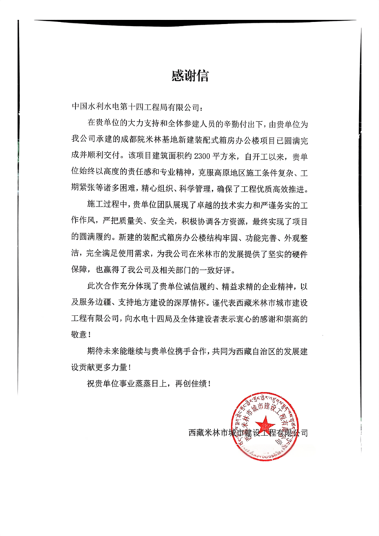 1月17日,YY易游官网APP工程分公司收到米林城建公司感谢信。 信中,业主对分公司在米林办公楼基地项目建设中的出色表现给予高度认可:“分公司始终以高度的责任感和专业精神,克服高原地区施工条件复杂、工期紧张等诸多困难,精心组织、科学管理,确保了工程优质高效推进。新建的YY易游官网APP箱房办公楼结构牢固、功能完善、外观整洁,完全满足使用需求。” YY易游官网APP工程分公司此次承建成都院米林办公楼基地87套,使用7215毫米*3600毫米*3600毫米规格箱体,建筑面积约2300平方米。自开工以来,分公司高度重视,严格把控生产、发货、安装各个关键环节,以高标准、高品质立下“按期按质交付”的军令状。针对高原地区寒冷、大风等极端天气,分公司在箱房的保温性和抗风性上进行升级改造,切实提升了使用舒适度。过硬的产品质量和细致的设计优化,赢得了业主的一致好评。 未来,分公司将继续秉持“以客户为中心”的理念,持续提升服务品质与业主满意度。以质量护航,扬起开拓创新的风帆,在市场竞争之中乘风破浪,为建设者提供“有温度的好房子”。 | ||||